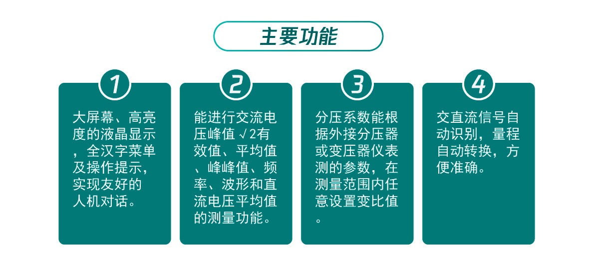 · 能進行交流電壓峰值√2有效值、平均值、峰峰值、頻率、波形和直流電壓平均值的測量功能;· 分壓系數能根據外接分壓器或變壓器儀表測的參數,在測量范圍內任意設置變比值;
