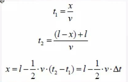 其原理示意如圖3所示。測試一條長度為l的電纜,假設在距測試端x處發(fā)生局部放電,脈沖將沿電纜向兩個相反方向傳播,其中一個脈沖經過時間t1到達測試端;另一個脈沖向測試端的對端傳播,并在對端發(fā)生反射,之后再向測試端傳播,經過時間t2到達測試端。根據兩個脈沖到達測試端的時間差,可計算局部放電發(fā)生位置,即