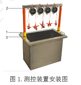 絕緣手套泄漏電流測控裝置具有多路復用結構,能實現4路絕緣手套或絕緣靴的試驗。裝置平臺由接地托盤、水槽、海綿地電極、不銹鋼托架、絕緣支撐桿和高壓無線微安表組成,安裝方法如圖1;