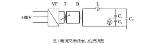 其中:VF表示變頻電源,T表示調壓器,B表示中間變壓器,L表示高壓電抗器,C1、C2表示分壓器電容,Cx表示試驗電纜,V表示電壓表。