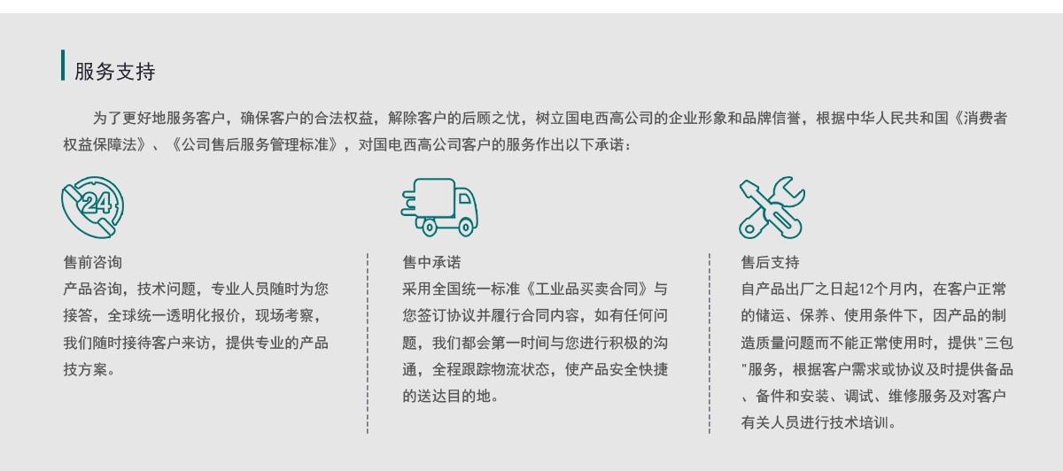 自產品出廠之日起12個月內,在客戶正常 的儲運、保養、使用條件下,因產品的制 造質量問題而不能正常使用時,提供"三包 "服務,根據客戶需求或協議及時提供備品 、備件和安裝、調試、維修服務及對客戶 有關人員進行技術培訓。