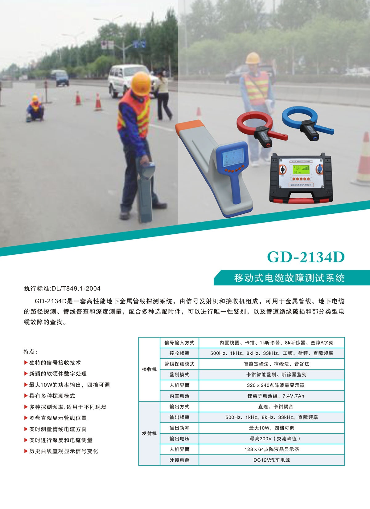 GD-2134D是一套高性能地下金屬管線探測系統,由信號發射機和接收機組成,可用于金屬管線、地下電纜的路徑探測、管線普查和深度測量,配合多種選配附件,可以進行唯一性鑒別,以及管道絕緣破損和部分類型電纜故障的查找。