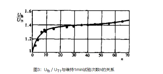 圖3為初始擊穿電壓與維持1min的試驗電壓比值和維持1min試驗次數的關系曲線。