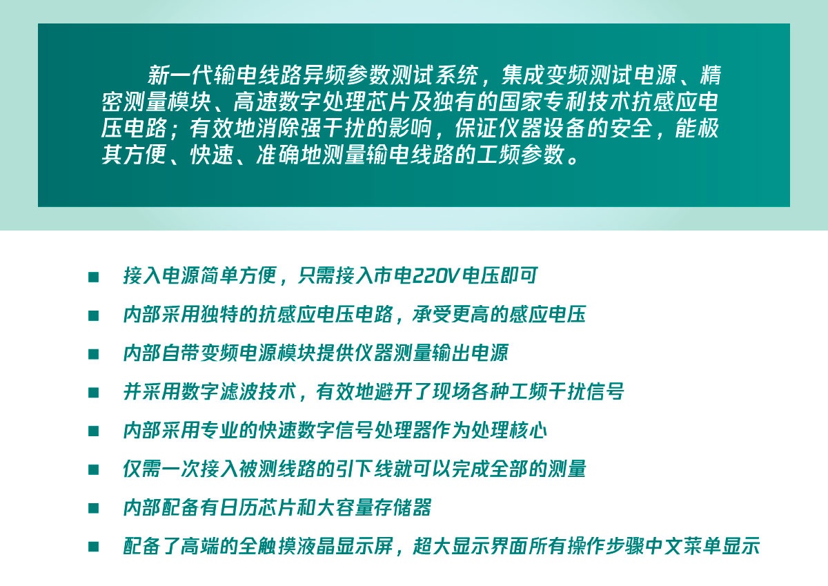 · 是現場測試各種高壓輸電線路(架空、電纜、架空電纜混合)工頻參數的高精度測試儀器;