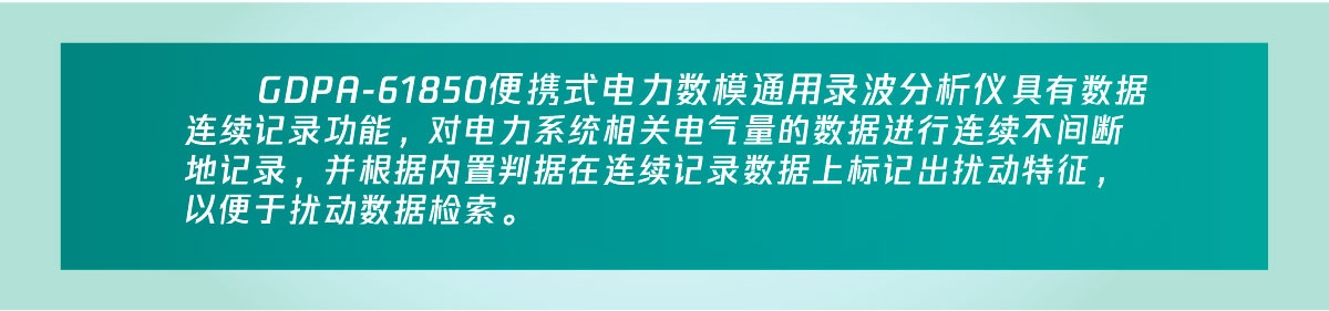 GDPA-61850便攜式電力數模通用錄波分析儀(以下簡稱GDPA-61850)可直接接入智能變電站過程層網絡的DL/T 860-9-2、GOOSE、IEEE 1588對時報文,當電力系統故障時,啟動暫態故障錄波,記錄系統的一次電壓電流波形以及二次設備的動作行為,實現電力系統故障分析與故障測距定位。GDPA-61850還具有數據連續記錄功能,對電力系統相關電氣量的數據進行連續不間斷地記錄,并根據內置判據在連續記錄數據上標記出擾動特征,以便于擾動數據檢索。