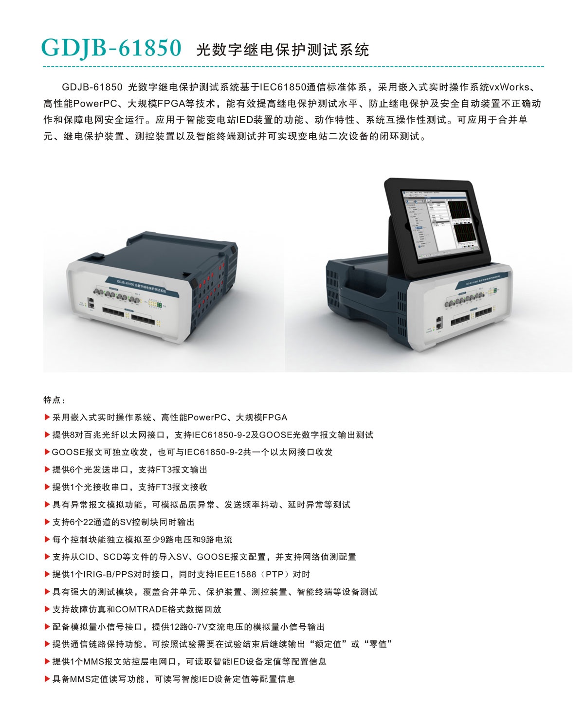GDJB-61850 光數字繼電保護測試系統基于IEC61850通信標準體系,采用嵌入式實時操作系統vxWorks、高性能PowerPC、大規模FPGA等技術,能有效提高繼電保護測試水平、防止繼電保護及安全自動裝置不正確動作和保障電網安全運行。應用于智能變電站IED裝置的功能、動作特性、系統互操作性測試。可應用于合并單元、繼電保護裝置、測控裝置以及智能終端測試并可實現變電站二次設備的閉環測試。