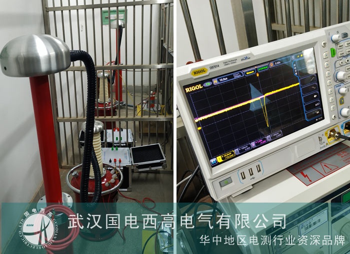 我司技術人員抵達西安交通大學重點實驗室后,隨即采用專用放電摸擬裝置在電壓為3.6KV下進行放電試驗。通過用示波器分別對放電信號和電壓信號采集分析放電圖譜和相位關系滿足理論要求。