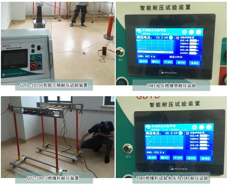 在客戶的組織下,試驗(yàn)前我司技術(shù)工程師對(duì)本次調(diào)試設(shè)備進(jìn)行設(shè)備組裝流程、接地線的方法、變壓器的連接、電源線的布局、注意事項(xiàng)等知識(shí)為客戶詳細(xì)培訓(xùn)。客戶充分掌握了該設(shè)備相關(guān)知識(shí)后,開始動(dòng)手操作GDYD-1010A智能工頻耐壓試驗(yàn)裝置,智能工頻耐壓試驗(yàn)裝置通過高壓線連接至100kV分壓器,儀器空升到100kV,誤差在1.5%以內(nèi),儀器正常。接著用這套設(shè)備對(duì)4.2*2m的絕緣墊做電壓為10kV的一分鐘耐壓試驗(yàn),測(cè)試合格。