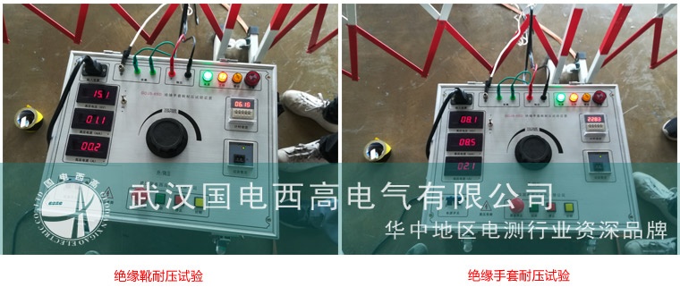 GDJS-65D絕緣手套靴耐壓試驗裝置對規格12kV絕緣手套、25kV絕緣靴的被試品分別升壓8kV和15kV,兩套被試品泄露電流均在合格范圍之內。