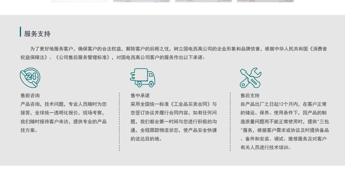 自產品出廠之日起12個月內,在客戶正常 的儲運、保養、使用條件下,因產品的制 造質量問題而不能正常使用時,提供"三包 "服務,根據客戶需求或協議及時提供備品 、備件和安裝、調試、維修服務及對客戶 有關人員進行技術培訓。