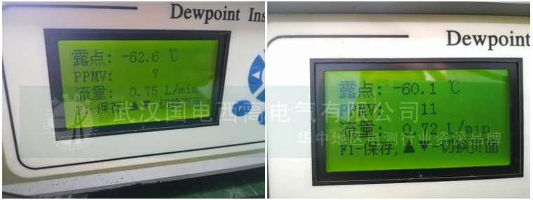 GDWS-242 SF6微水測量儀進行檢測時,先用高純氮清洗測量管道,通過調節測量管道上的針型閥,流量調節到0.75L/min,測出數據:7ppmv;后續還對SF6新氣微水值也做了同樣測量,得出結果為11ppmv。兩項試驗均符合標準。